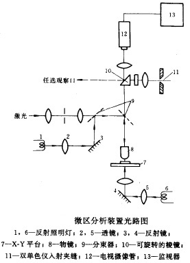 利用光學顯微鏡,將激光會聚到樣品的微小部位(直徑小至幾微米),采用電視攝像管、監(jiān)視器等裝置,可直接觀察到放大圖像,以便把激光點對準待測定的微小部位,經光束轉換裝置,即可將微區(qū)的拉曼散射信號聚焦到單色儀入射狹縫,得到該部位的拉曼光譜圖。儀器裝置的光路圖見下圖。