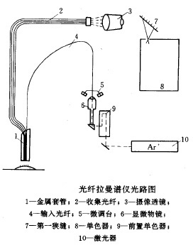 光導纖維探針引入拉曼光譜技術,必將會得到重大的發(fā)展。激光光源經過顯微鏡的聚焦,進入光導纖維,由樣品產生拉曼散射經光導纖維收集,再經分光得拉曼光譜,光路示意圖如下。