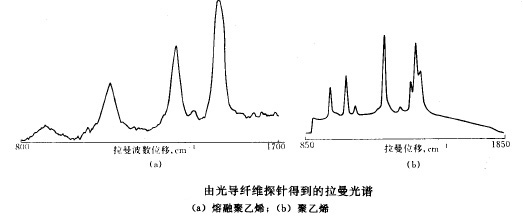 光導纖維光路特別適用于遙測技術,它使激光經光導纖維遠距離傳輸成為可能,同時,拉曼信號也可遠距離返回拉曼光譜儀,這大大拓寬了拉曼光譜技術的應用,對于化學反應的實時分析、環(huán)境監(jiān)測以及電極表面的跟蹤將是有力的手段。特別是對于有毒、有放射性污染甚至于放射化工的遙控,提供了新的分析手段。此外,對于熔融鹽體系、高聚物的熔化以及體內生物過程的研究都是未來的實時分析新領域。下圖為熔化狀聚乙烯經光導纖維直接采集到的拉曼光譜圖。