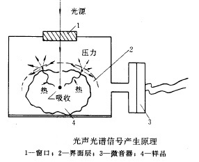 光聲光譜儀中光聲信號的產(chǎn)生 如下圖所示,經(jīng)過調(diào)制的光輻射,透射過窗口(FTIR-PAS 中多用嗅化鉀晶體,UV-PAS 中多用石英玻璃),射進(jìn)密封的光聲池內(nèi),并輻照在樣品上,樣品吸收了光輻射的能量,樣品的分子被激發(fā)到激發(fā)態(tài),在這種情況下,樣品不發(fā)生化學(xué)反應(yīng)。為此處于激發(fā)態(tài)的樣品分子由于密封在特制的光聲池內(nèi),不能將吸收的能量輻射躍遷到外面,包括不能發(fā)生分子間的能量傳遞到池外。而是以非活化的非輻射躍遷過程,將這種能量轉(zhuǎn)化為熱能,形成樣品的溫度升高,這種溫度升高與下降與入射光的調(diào)制有關(guān)。若入射光的強(qiáng)度是經(jīng)斬波器,干涉儀等調(diào)制的光,且其調(diào)制的速度小于上述非輻射躍遷變化的速度,那么光學(xué)調(diào)制就能產(chǎn)生樣品溫度的相應(yīng)調(diào)制,也就是產(chǎn)生了與調(diào)制頻率相同頻率的熱效應(yīng),由此而形成了“熱波”。此樣品產(chǎn)生的熱波傳遞到樣品與池內(nèi)氣體的界面,稱之為界面層(boundary layer) ,樣品的這一界面層即產(chǎn)生周期性的漲落變化,相當(dāng)于物體的熱漲冷縮的變化規(guī)律,這一周期性的“熱波”引起密封的光聲池內(nèi)氣體產(chǎn)生振動形成聲波,也就是入射光使光聲池內(nèi)產(chǎn)生音(波)。而微音器即是將這種聲音(波)接收,并轉(zhuǎn)為電信號,經(jīng)前置放大器放大而送到計(jì)算機(jī)或其它檢測設(shè)備上,這樣即獲得了樣品的光聲光譜,如果入射光是一束干涉光,并經(jīng)過FTIR 儀器,則得到的是紅外光聲光譜。由于光聲信號與樣品吸收光能后的非輻射躍遷有關(guān),也就是只與樣品吸收的那部分光能有關(guān),與樣品的散射的光輻射無關(guān),因而光聲光譜儀器對于高分散,強(qiáng)吸收的樣品特別靈敏且易于分析。