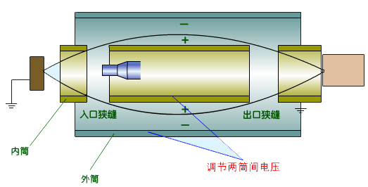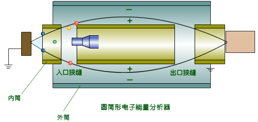 筒鏡分析器是由兩個(gè)同軸的圓筒形電極構(gòu)成的靜電反射系統(tǒng)。內(nèi)筒上開(kāi)由環(huán)狀的電子入口狹縫和出口狹縫,在兩筒之間加一定的電壓。從樣品中激發(fā)的電子以一定角度從入口狹縫進(jìn)入內(nèi)筒和外筒之間的區(qū)域,調(diào)節(jié)兩筒之間的電壓,使能量滿足一定條件的俄歇電子才能通過(guò)出口狹縫,而能量不滿足條件的帶電粒子只會(huì)被內(nèi)外筒吸收。