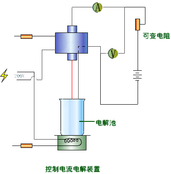 在恒電流電解裝置中,試液置于電解池中,用直流電源作為電解電源,用可變電阻器調(diào)節(jié)加在電解池上的電壓。通過電解池中的電流可以從