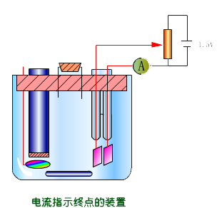 過程:用一小電壓(50~100mV)極化兩鉑電極(也有用兩銀電極),測(cè)量電流的突然改變,在反應(yīng)終點(diǎn)前后,指示電極的電流迅速發(fā)生變化或變化立即停止,則表示到達(dá)終點(diǎn)。