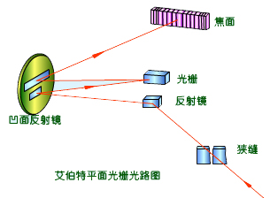 艾伯特平面光柵分光系統(tǒng)是垂直對稱式平面光柵裝置。其特點是用一塊球面反射鏡的兩部分分別代替準(zhǔn)直物鏡和暗箱物鏡。優(yōu)點是結(jié)構(gòu)緊湊,像散較小。