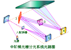 中階梯光柵分光系統(tǒng)有很高的色散率和集光本領(lǐng)。入射光由準(zhǔn)直鏡定向到光柵上,衍射后的光經(jīng)棱形透鏡聚焦到系統(tǒng)的焦平面上。棱形透鏡除起聚焦作用外,還起分級器的作用,將不同級次互相重疊的光譜分成二維光譜,成像在孔板上,孔板上安裝出射狹縫。
