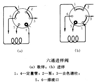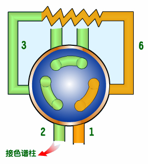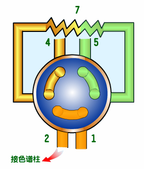 六通閥處于取樣位置時(shí),載氣經(jīng)1,2兩通道直接進(jìn)入色譜柱,無樣品進(jìn)入色譜儀,氣體樣品經(jīng)通道5流入接在通道3,6上的定量管7中,經(jīng)通道4流出,使定量管充滿樣品。