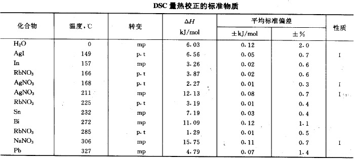 國際熱分析協(xié)會(ICTA)所設(shè)立的標(biāo)準(zhǔn)化委員會已確定了4 種低溫標(biāo)準(zhǔn)物質(zhì)和10 種溫度范圍為125~940℃ 的標(biāo)準(zhǔn)物質(zhì)用于溫度校準(zhǔn)。后10 種標(biāo)準(zhǔn)物質(zhì)已由美國國家標(biāo)準(zhǔn)局(NBS)組成編號為758~760 的3 組標(biāo)準(zhǔn)物質(zhì)。每組由5 種組成,它們的溫度范圍分別為:125~435 ℃ ,295~675 ℃ 和570~940℃。這14 種標(biāo)準(zhǔn)物質(zhì)和它們的相變溫度見下表。