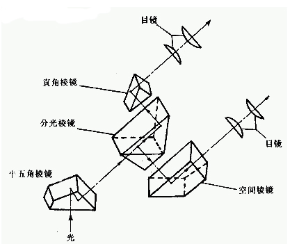 來自物鏡的光線經半五角棱鏡兩次反射后,折轉45度進入分光棱鏡。分光棱鏡由兩塊直角棱鏡膠合而成。膠合面上鍍有分光膜。當光到達分光膜時,有一半反射,進入下棱鏡,另一半光透過分光膜,進入上棱鏡。光線被上下兩個棱鏡(即直角棱鏡及空間棱鏡)反射后進入兩個目鏡中成像。