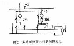 主要針對母聯(lián)間隔改造或檢修后,由本站進行充電的情況。具體做法是:騰空1條母線,由旁路斷路器向旁路母線充電,用本站某一線路間隔經(jīng)旁路母線,用旁路斷路器,再通過空母線向母聯(lián)間隔充電,見圖2。