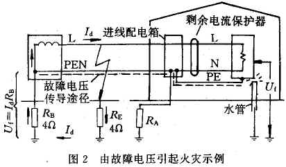 TN 系統(tǒng)的 PE(PEN)線作重復(fù)接地后可降低一些故障電壓,但效果不明顯。電氣線路上的剩馀電流保護(hù)器對這種外來的故障電壓毫無反應(yīng),因?yàn)榫路內(nèi)沒有出現(xiàn)剩馀電流。