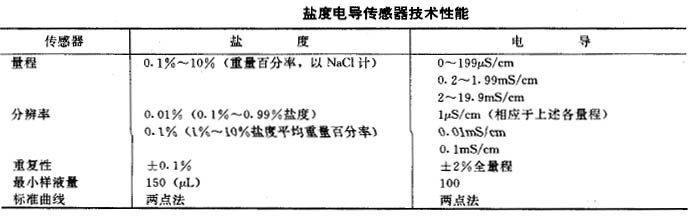 基于電解質溶液的電導與電解質濃度之間存在依賴關系進行測定。此型傳感器用于離子色譜中作檢測器,如下圖所示。商品鹽度傳感器也是基于電導測量原理制成的。下表給出COLE-PALMER 及HORIBA 公司1993年商品傳感器的技術性能。