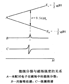 置于磁場中的未配對電子,其自旋磁矩與磁場相互作用,能級發(fā)生分裂,稱為塞曼分裂( Zeeman splitting)。能級分裂的大小與磁場強度成正比(見下圖)。這時如果再在與磁場垂直的方向加一個微波磁場(頻率為ν),當微波能量hν等于兩個能級之差時(即hν=△E),則發(fā)生能級間的電子躍遷,稱為共振吸收。