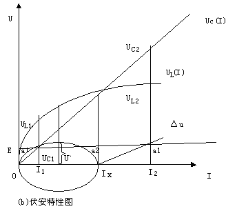 正常時,電路工作在a1點,電感上的壓降UL1要大于電容上的壓降UC1,電流落后于電源電壓。當電源電壓E小于△u曲線部分的最高點U`時,電路是穩(wěn)定的。即使電源有某種程度的波動,仍可回到工作點a1。但當電源電壓瞬間超過U`時,電感由于鐵芯和感抗下降,電感上的壓降UL(I)與電容上的壓降UC(I)之間的差值反而減小,即電源電壓E 越來越大于電路的總電壓降△u,使電流迅速增大。直到電流達到I2,在新的工作點a2重新穩(wěn)定下來,這時無論是電容上的壓降UC(I)或電感上的壓降UL(I)都大大超過電源電壓。全電路從原來的呈現(xiàn)感性變?yōu)槌扇菪浴?