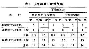 測(cè)距儀檢測(cè)法和傳統(tǒng)的檢測(cè)法對(duì)十幾臺(tái)各種型式的起重機(jī)額定載荷彈性下?lián)隙冗M(jìn)行了比對(duì)試驗(yàn),檢測(cè)結(jié)果是一致的。因篇幅所限,現(xiàn)將其中3臺(tái)(1臺(tái)跨度13.5m起升高度6m的單梁橋式起重機(jī);1臺(tái)跨度16.5m起升高度9m的雙梁橋式起重機(jī):1臺(tái)跨度22.5m起升高度15m的雙梁門式起重機(jī))的比對(duì)數(shù)據(jù)列表1如下。