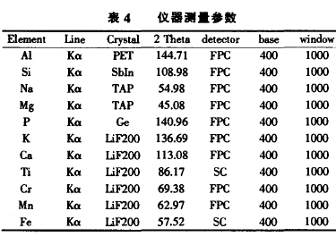根據(jù)樣品中待測(cè)元素譜線特點(diǎn),確定所用的晶體和探測(cè)器, 掃描確定峰等參數(shù),儀器測(cè)量參數(shù)見(jiàn)表4。