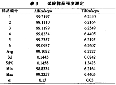 經(jīng)過(guò)不同熔融時(shí)問(wèn)和溫度試驗(yàn),對(duì)于高鋁耐火材料,稱取相同的試樣(D031,A12O392.59% ,Ti2O3 3.56%)六份,在相同熔融時(shí)問(wèn)(25min)和溫度(1100℃)下熔融玻璃片,經(jīng)X射線熒光光譜儀測(cè)定元素的強(qiáng)度,結(jié)果見(jiàn)表3。
