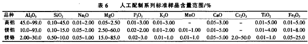 由于我國(guó)沒(méi)有系列高鋁、鎂鋁、鎂鉻校準(zhǔn)樣品,根據(jù)試驗(yàn)范圍,利用標(biāo)準(zhǔn)樣品和其它標(biāo)準(zhǔn)樣品及純?cè)噭┡渲葡盗袠?biāo)準(zhǔn)玻璃片。人工配制的系列標(biāo)準(zhǔn)樣品含量范圍見(jiàn)表6。