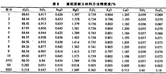 高鋁質(zhì)、鎂鋁質(zhì)及鎂鉻質(zhì)耐火材料同一試樣熔制十片玻璃片,分別測(cè)定其濃度。方法精密度結(jié)果見(jiàn)表8~10。