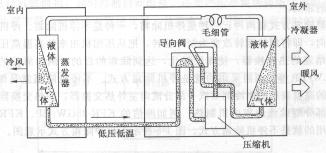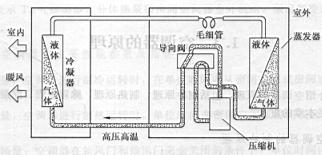 空調(diào)熱泵制熱是利用制冷系統(tǒng)的壓縮冷凝熱來加熱室內(nèi)空氣的,如圖 1‑2所示。低壓、低溫制冷劑液體在蒸發(fā)器內(nèi)蒸發(fā)吸熱,而高溫高壓制冷劑氣體在冷凝器內(nèi)放熱冷凝。熱泵制熱時通過四通閥來改變制冷劑的循環(huán)方向,使原來制冷工作時做為蒸發(fā)器的室內(nèi)盤管變成制熱時的蒸發(fā)器,這樣制冷系統(tǒng)在室外吸熱,室內(nèi)放熱,實現(xiàn)制熱的目的。