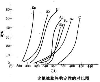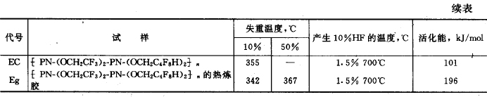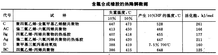 Knight 等對含氟橡膠的熱穩(wěn)定性作了研究,所采用的實驗條件為:樣品4mg ,空氣流速50ml / min 和加熱速率2 ℃/min 。其測定結果列于下表中。