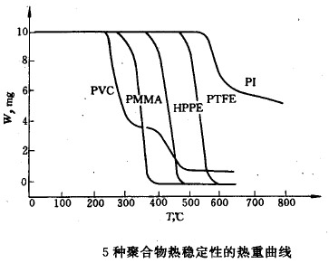 根據(jù)熱重曲線能夠很簡便地比較這些高聚物的熱穩(wěn)定性。顯然,這種對比方法只有嚴格控制好相同的實驗條件才可獲得可靠的結果。