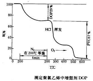 。╞)聚氯乙烯(PVC)中增塑劑鄰苯二辛酯(DOP)的測定,見下圖。在測定過程中先以每分鐘160 ℃ 的升溫速率加熱,達到200℃ 后等溫4min 。這4min 足以使98%的增塑劑擴散到試樣表面而揮發(fā)掉。然后用每分鐘80℃ 的升溫速率加熱。并且在200℃ 以后通過氣體轉換閥將氮氣流轉換為氧氣以保證有機物完全燃燒。最后剩下惰性無機填料約3.5%。