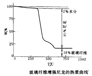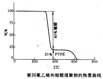 熱重法也可用于聚合物的混合物的測定,例如聚四氟乙烯與縮醛混聚物的相對含量可通過熱重曲線分析出來,見下圖。在TG曲線上表示出該混合物含有縮醛樹脂80%和聚四氟乙烯20%。