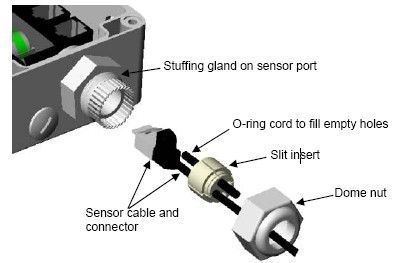 6。傳感器連接器插入的圓頂螺母通過(guò)。圓頂螺母的螺紋端應(yīng)該面臨對(duì)連接器。然后,將通過(guò)填料壓蓋,并通過(guò)電纜孔中的情況。推入縫插電纜。