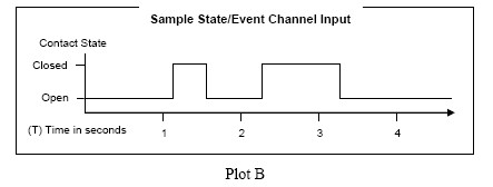 事件通道,記錄了從一個(gè)封閉的接觸過渡到一個(gè)開放的接觸。記錄器檢查每一個(gè)第二次看到,如果一個(gè)轉(zhuǎn)變發(fā)生在最后一秒鐘。如果發(fā)生轉(zhuǎn)變,這是作為一個(gè)在這第二個(gè)事件記錄。因此,如果上面顯示在B地塊的接觸活動(dòng)是事件通道,事件被記錄在T2和另一個(gè)事件記錄在T4。注意T2和T3之間的公開T3和T4,造成事件被記錄在T4之間密切的接觸。關(guān)閉的接觸不觸發(fā)事件;他們后來的重新開放。