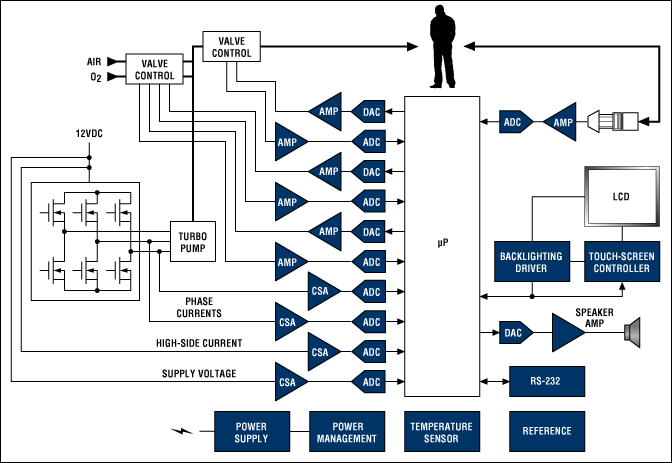 呼吸機系統(tǒng)的功能框圖。 Maxim的建議呼吸機的設(shè)計解決方案的列表,