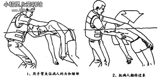 。5)救生者被溺者從后面攔腰抱住的解脫方法 : 首先,救生者被抱住后,用手觸摸溺者手指,找其食指或無名指,并抓住它用力向外分開,再將溺者雙手分別向上向下伸展,然后松開向下伸展之手,并立即退至其后,待溺者冷靜后再進行拖運。