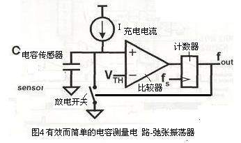 弛張振蕩器是一種有效而簡單的電容丈量電路。典型的弛張振蕩器電路拓撲結(jié)構(gòu)示于圖4。該電路由4個元件組成,一開始.放電開關處于開路狀態(tài)。當該開關開路時,全部電流均進進傳感器。導致其電壓線性轉(zhuǎn)換。該充電操縱持續(xù)進行。直至傳感器電壓達到比較器的門限電平為止。比較器隨后從低電平變換至高電平,導致放電開封閉合。電容式傳感器通過該低阻抗路徑迅速放電至地。該過程將使比較器的輸出從高電平變換至低電平.然后重復這一循環(huán)。如下面的公式所示,輸出頻率(fout)與充電電流成正比,而與門限電壓和傳感器電容成反比。丈量該頻率.以確定傳感器電容: