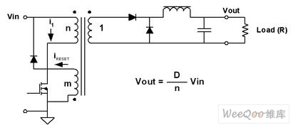 圖1中的這個(gè)拓?fù)湎喈?dāng)受到歡迎,主要原因是元件數(shù)少且設(shè)計(jì)要求簡單,但對于不同負(fù)載情況的高效能要求卻為這個(gè)拓?fù)鋷硇绿魬?zhàn)。在接近滿載或滿載時(shí),這個(gè)拓?fù)涞男苁艿?0%占空比的限制。而在較輕負(fù)載時(shí),開關(guān)耗損是造成效能不佳的主要原因。很多較新的設(shè)計(jì)采用功率因數(shù)校正(PFC)前端來降低諧波電流,在400 V的PFC輸出電壓下,單開關(guān)正向方式被迫使用大于900 V的開關(guān),進(jìn)步了FET的本錢。