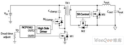 圖4 采用安森美半導(dǎo)體NCP1562的有源鉗位正激拓補(bǔ)結(jié)構(gòu)