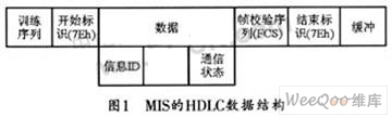 MIS的數(shù)據(jù)控制采用高級(jí)數(shù)據(jù)鏈路控制規(guī)程(HDLC)。HDLC是面向比特的協(xié)議,使用位填充來保證數(shù)據(jù)的透明性。HDLC規(guī)程具有透明傳輸、控制簡(jiǎn)單、可靠性高、傳輸效率高的特點(diǎn),因而具有極大的靈活性。圖1所示是MIS系統(tǒng)的HDLC數(shù)據(jù)結(jié)構(gòu)。