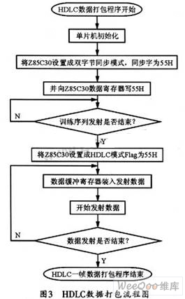 Z85C30有兩個(gè)通道,每個(gè)通道可以發(fā)送,也可以接收數(shù)據(jù)。由于數(shù)據(jù)的拆包只是數(shù)據(jù)打包的逆過程,并且Z85C30也支持HDLC幀數(shù)據(jù)的拆包,所以,在此只介紹如何進(jìn)行數(shù)據(jù)打包。將打包的數(shù)據(jù)發(fā)給GMSK調(diào)制解調(diào)器,就可以得到很好的GMSK信號(hào),這樣,GMSK信號(hào)就可以由高頻板調(diào)制發(fā)射出去,以便和其他臺(tái)站實(shí)現(xiàn)通信。本系統(tǒng)的軟件流程如圖3所示。