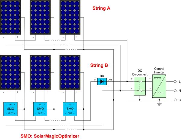 組列 B 的所有模塊由于遮蔽、定向傾斜或聚集了更多的灰塵而具有不同的特征或照射失調(diào)。每個(gè)模塊的輸出在 SolarMagic™優(yōu)化器(SMO)模塊的輸入點(diǎn)相連。每個(gè) SMO 的輸出采用與組列 A模塊相同的串聯(lián)方式。