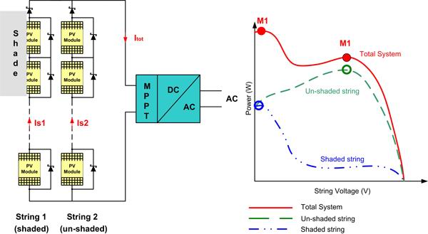 當(dāng)光伏陣列受到遮蔽而出現(xiàn)上述情況時(shí),會(huì)產(chǎn)生一條具有多個(gè)峰值的 V-P 電氣曲線。圖 1 顯示了具有集中式最大功率點(diǎn)跟蹤系統(tǒng)( MPPT) 功能的標(biāo)準(zhǔn)并網(wǎng)配置,其中一個(gè)組列的兩個(gè)電池板被遮蔽。集中式 MPPT無(wú)法設(shè)置直流電壓,因此無(wú)法令兩個(gè)組列的輸出功率都達(dá)到最大。在高直流電壓點(diǎn) (M1),MPPT 使未遮蔽組列的輸出功率達(dá)到最大。在低直流電壓點(diǎn) (M2),MPPT 將使遮蔽組列的輸出功率達(dá)到最大:旁路二極管繞過(guò)遮蔽電池板,此組列的未遮蔽電池板將提供全量電流。陣列的多個(gè) MPP 可能導(dǎo)致集中最大功率點(diǎn)跟蹤(MPPT)配置的額外損失,因?yàn)樽畲蠊β庶c(diǎn)跟蹤器可能得到錯(cuò)誤信息停止在局部最大點(diǎn)處,并穩(wěn)定在具有V-P特征的次優(yōu)點(diǎn)。