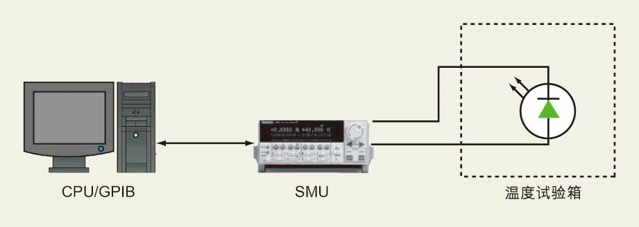 在這個測試方法中,待測器件(DUT)被放置在溫度試驗箱內(nèi)并與驅(qū)動設(shè)備和測量設(shè)備相連。驅(qū)動設(shè)備可能是可編程電流源和伏特計,但其它儀器可以同時提供電流和測量電壓,這些儀器通常被稱為源測量單元(SMU),它們可大大簡化測量儀器(圖1)。