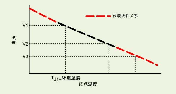 一種更好的解決方法是利用結(jié)點本身作為溫度傳感器。對大多數(shù)材料來說,結(jié)點正向壓降和結(jié)點溫度之間都存在密切的相關(guān)性。什么時候結(jié)點正向壓降與結(jié)點溫度呈非線性關(guān)系取決于結(jié)點的材料和設(shè)計。在溫度高達80°C至100°C的正常工作環(huán)境中,假設(shè)大多數(shù)材料的結(jié)點正向壓降與結(jié)點溫度為線性是安全的。非線性特性可以通過實驗方法來確定,即在更高的環(huán)境溫度下測量電壓,直到結(jié)點正向壓降與結(jié)點溫度為非線性。對于大多數(shù)器件而言,這種關(guān)系接近線性關(guān)系,可以用數(shù)學公式表達如下: