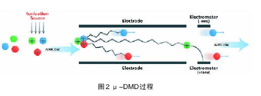 甚至在濃度的基質(zhì)氣體與目標(biāo)組分一同流出的情況,利用微分遷移檢測(cè)器仍可以對(duì)痕量級(jí)化合物中目標(biāo)組分進(jìn)行檢測(cè)。這可能是由于微分遷移檢測(cè)器應(yīng)用的是過(guò)濾及檢測(cè)機(jī)理與μ-DMD的檢測(cè)機(jī)理正交。微分遷移檢測(cè)器的選擇性依賴于分析離子從檢測(cè)器移動(dòng)到放大高頻調(diào)節(jié)電場(chǎng)的遷移率響應(yīng)。調(diào)節(jié)好的檢測(cè)器將只能檢測(cè)到那些在遷移范圍內(nèi)的離子。