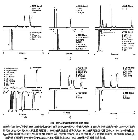 僅僅只配備μ -TCD的氣相色譜儀的分離選擇性不能夠達(dá)到分析的要求,并且沒(méi)有足夠的動(dòng)態(tài)檢測(cè)范圍來(lái)分析和檢測(cè)碳?xì)浠衔飿悠分械暮哿苛蚧铩J褂昧蛄讬z測(cè)器或化學(xué)發(fā)光檢測(cè)器的方法,在改變痕量分析物和基質(zhì)氣體之間的比例時(shí)都會(huì)引起方法的穩(wěn)定性降低和/或發(fā)光淬滅,這種情況下不采用連續(xù)調(diào)節(jié)器就不能夠得到正確檢測(cè)結(jié)果。μ -TCD 相反,CP-4900 中的微分遷移檢測(cè)器能夠在高濃度的碳?xì)浠衔锘|(zhì)中對(duì)痕量目標(biāo)硫化合物進(jìn)行快速的檢測(cè)和定量(循環(huán)時(shí)間<90s)。由于每個(gè)檢測(cè)器都具有很高的檢測(cè)靈敏度和選擇性,適合于痕量(μ -DMD)分析和ppm%(μ -TCD)濃度級(jí)別范圍的分析測(cè)定,因此無(wú)須在樣品濃度改變時(shí)進(jìn)行動(dòng)態(tài)響應(yīng)調(diào)節(jié)。