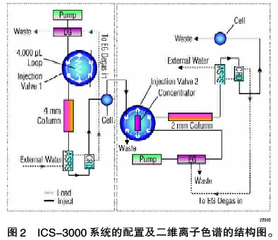 ICS-3000 系統(tǒng)為雙通道二元系統(tǒng)。第一維的進(jìn)樣閥配備了1 個(gè)大體積的定量環(huán)(4 mL)。第二維的進(jìn)樣閥配有1 根富集柱,可以將第一維洗脫下的峰經(jīng)切割濃縮后送入第二維進(jìn)行進(jìn)一步的分析。