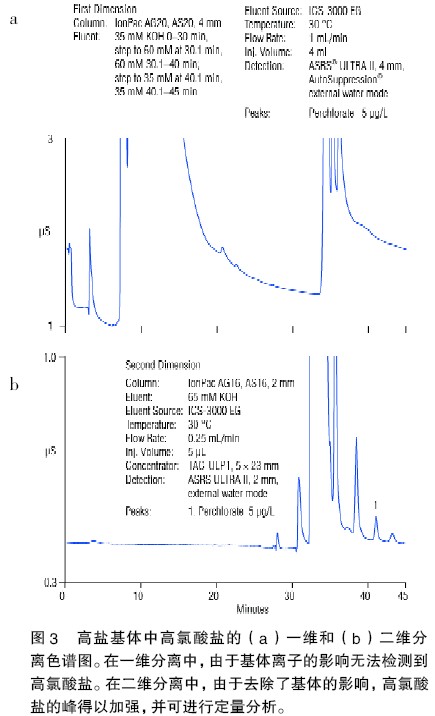 圖2 給出的是可以去除基體并能增強(qiáng)信號(hào)的二維IC 示意圖。采用二維系統(tǒng)轉(zhuǎn)移基體具有幾個(gè)優(yōu)點(diǎn)。首先,可以將樣品大體積進(jìn)樣到1 根4 mm的色譜柱上。這不僅是因?yàn)樵撋V柱的柱容量較大,并且對(duì)高氯酸鹽具有比對(duì)基體更高的選擇性。其次,經(jīng)第一維分離部分分開的高氯酸鹽可在第二維的富集柱上濃縮。用堿洗脫下來的被抑制的洗脫物為水,可以為離子交換保留和濃縮提供理想的環(huán)境。再次,使用比第一維更低的流速進(jìn)行第二維的分離,從而提高樣品的檢測(cè)靈敏度。最后,該方法將兩種不同分離機(jī)理整合在一起,可以得到采用任何一維分離模式都得不到的高選擇性。