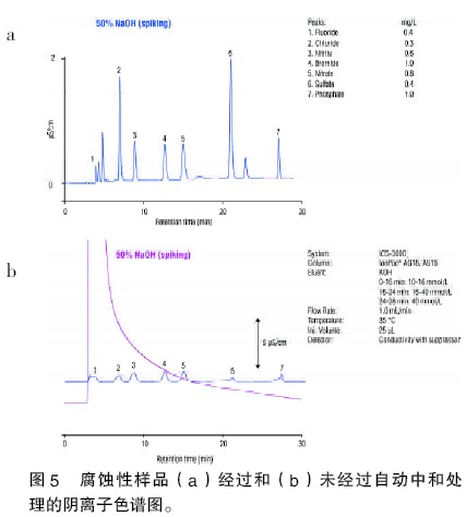 圖5 給出了高濃度堿性樣品中的陰離子經(jīng)過(a)和未經(jīng)過(b)中和作用的對(duì)比分析結(jié)果。對(duì)于沒有經(jīng)過中和作用處理的樣品,陰離子在1%氫氧化鈉溶液中的譜峰寬,靈敏度差。當(dāng)陰離子在50 %氫氧化鈉溶液中時(shí),基體的背景很高,幾乎檢測(cè)不到其他陰離子。圖5-a 顯示的是樣品經(jīng)過中和作用處理后的結(jié)果?梢钥闯,高背景已經(jīng)被有效去除,能夠檢測(cè)到陰離子,并且樣品的回收率也很高。