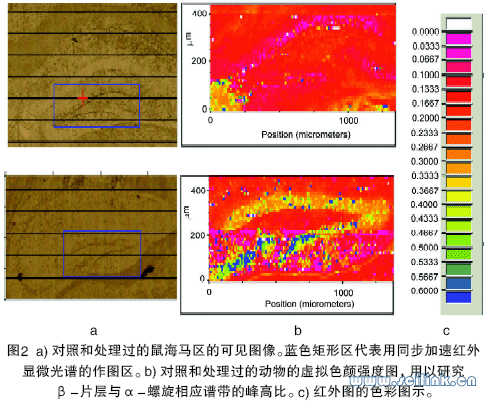 圖2 a 表示了分別給普通飲用水的Tg 鼠和富含鐵的水的Tg 鼠在海馬區(qū)的可見(jiàn)圖像,藍(lán)色矩形劃出的是紅外切片圖。圖2 b 顯示了掃描區(qū)的虛擬色彩紅外圖像,色彩圖示代表的是β - 片層與α - 螺旋蛋白構(gòu)型分別在1625 和1650 cm-1 的峰高比。飲用富含鐵水的動(dòng)物表現(xiàn)出由α - 螺旋向β - 折疊構(gòu)象的轉(zhuǎn)變,這種轉(zhuǎn)變可能是由于存在更多的鐵引發(fā)的;赥g APP2576 鼠的海馬區(qū)Aβ蛋白的存在[11]以及近期工作揭示的鐵可誘導(dǎo)Aβ構(gòu)型轉(zhuǎn)化為難溶形式(β - 片層),作者認(rèn)為這些可見(jiàn)的構(gòu)型變化存在于Aβ蛋白。進(jìn)一步的研究將在用富含鐵和鋅的水飼養(yǎng)的Tg 模型和正常動(dòng)物中進(jìn)行。如果像以前研究揭示的那樣,鋅對(duì)Aβ蛋白構(gòu)象的影響和鐵不同[10,13]。那么,比較用鐵和鋅處理的動(dòng)物將會(huì)是十分有趣的。