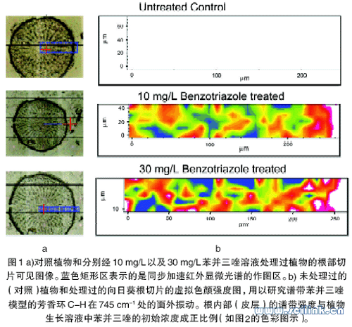 向日葵類植物在濃度低于1 mmol/L 的苯并三唑的水溶液中培養(yǎng)時(shí),吸收和結(jié)合了低濃度苯并三唑的向日葵屬植物和未經(jīng)處理的向日葵的發(fā)育情況幾乎一樣。在高濃度溶液中培養(yǎng)后,根部的切片變得非常脆弱,并在顯微鏡下可以觀察到變化。由于苯并三唑的吸收、結(jié)合和/ 或生物轉(zhuǎn)化使根部發(fā)生變化的組成包括糖類、纖維素、木質(zhì)素和蛋白質(zhì)。這些變化可以用反射吸收顯微光譜來(lái)監(jiān)測(cè)。經(jīng)處理過(guò)的根部剖面虛擬色彩強(qiáng)度圖以及在745cm-1 的特征苯并三唑峰的存在顯示了根部組成的變化(圖1)。在745cm-1 處出現(xiàn)的芳香環(huán)CH 峰以及在木質(zhì)素結(jié)構(gòu)中的變化證明了苯并三唑中芳香環(huán)沒(méi)有被破壞而是與植物體結(jié)合。這個(gè)例子證明了在植物治理的研究中,紅外顯微光譜可以作為一種研究因在水或土壤中存在有機(jī)污染物而導(dǎo)致植物結(jié)構(gòu)變化的工具。