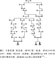 為了比較高通量SNP芯片和微衛(wèi)星標(biāo)記對家族性遺傳圖譜的有效性,作者利用大量不帶D型隱性尼曼-皮克病的新斯科舍阿卡迪亞家族成員驗(yàn)證一個(gè)已知的遺傳連鎖[9,10]。通過原位克隆鑒定得知潛在的致病基因是NPC1(OMIM#257220)[11],從而在新斯科舍家族患病個(gè)體中證實(shí)了NCPI存在著純合子突變[12]。作者又利用Xba 50K芯片(Affymetrix公司,圣克拉拉,加拿大)對兩位患病的遠(yuǎn)房親屬和一位該家族未患病親屬進(jìn)行基因分型(見圖2)。如表1所示,兩位患者 18號染色體上相同的等位基因中,具有共享純合性的SNPs的最大拉伸長度約為7.7M堿基對,其中包括圍繞NPC1的位于19.4M堿基對處的71個(gè)連續(xù)的SNPs。未患病親屬樣本2244中有30個(gè)標(biāo)記與患病者不一致,某些是雜合子而另一些是其他SNP等位基因的純合子(該數(shù)據(jù)未顯示)。由此可見 SNP芯片可以省時(shí)、省力、省錢地成功復(fù)制整個(gè)家族樣品的連鎖圖譜。