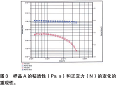 圖3中顯示了樣品A的屈服應(yīng)力實(shí)驗(yàn)中粘度(Pa?s)與剪切力(Pa)的關(guān)系圖。此外,還可以看出正交力(N)在整個(gè)測(cè)試過(guò)程中一直保持不便,這說(shuō)明樣品的緊密度是均勻的。數(shù)據(jù)的可重復(fù)顯示出較好的重現(xiàn)性。使用實(shí)驗(yàn)室內(nèi)部設(shè)計(jì)的軟件工具,所有實(shí)驗(yàn)的屈服應(yīng)力如表1所示。表1中顯示的多種樣品的平均屈服應(yīng)力值是通過(guò)重復(fù)多次實(shí)驗(yàn)得到。