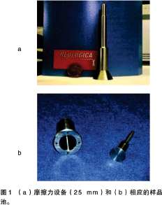 作者使用最新設(shè)計(jì)的摩擦力測(cè)量系統(tǒng)(ATS RheoSystems/ REOLOGICA Instruments,Bordentown,NJ)(見圖 1a和b)研究了4種完全不同的碳酸鈣粉末樣品的行為特性。粉末樣品分類如下:未經(jīng)處理的樣品分A,B兩種;處理后的樣品也分A,B兩種。樣品標(biāo)示為“處理”是指涂敷了一層修飾物。樣品A與樣品B相比具有較低的平均粒徑分布。實(shí)驗(yàn)過(guò)程在一套附帶25 mm摩擦工具和樣品池的全自動(dòng)NOVO 流變儀(ATS RheoSystems/ REOLOGICA Instruments)(見圖 2)中進(jìn)行。NOVO 流變儀配備了專利保護(hù)的差壓正交力(DPNF)傳感器以提供高精度和靈敏度的正向力。測(cè)量系統(tǒng)可用來(lái)研究粉末樣品的流動(dòng)性和摩擦力性能。最近人們發(fā)展了一種用來(lái)測(cè)試粉末流動(dòng)過(guò)程中界面處摩擦力的方法。因此,在此基礎(chǔ)上可以建立在剪切速率條件下表征粉末流動(dòng)性的方法。